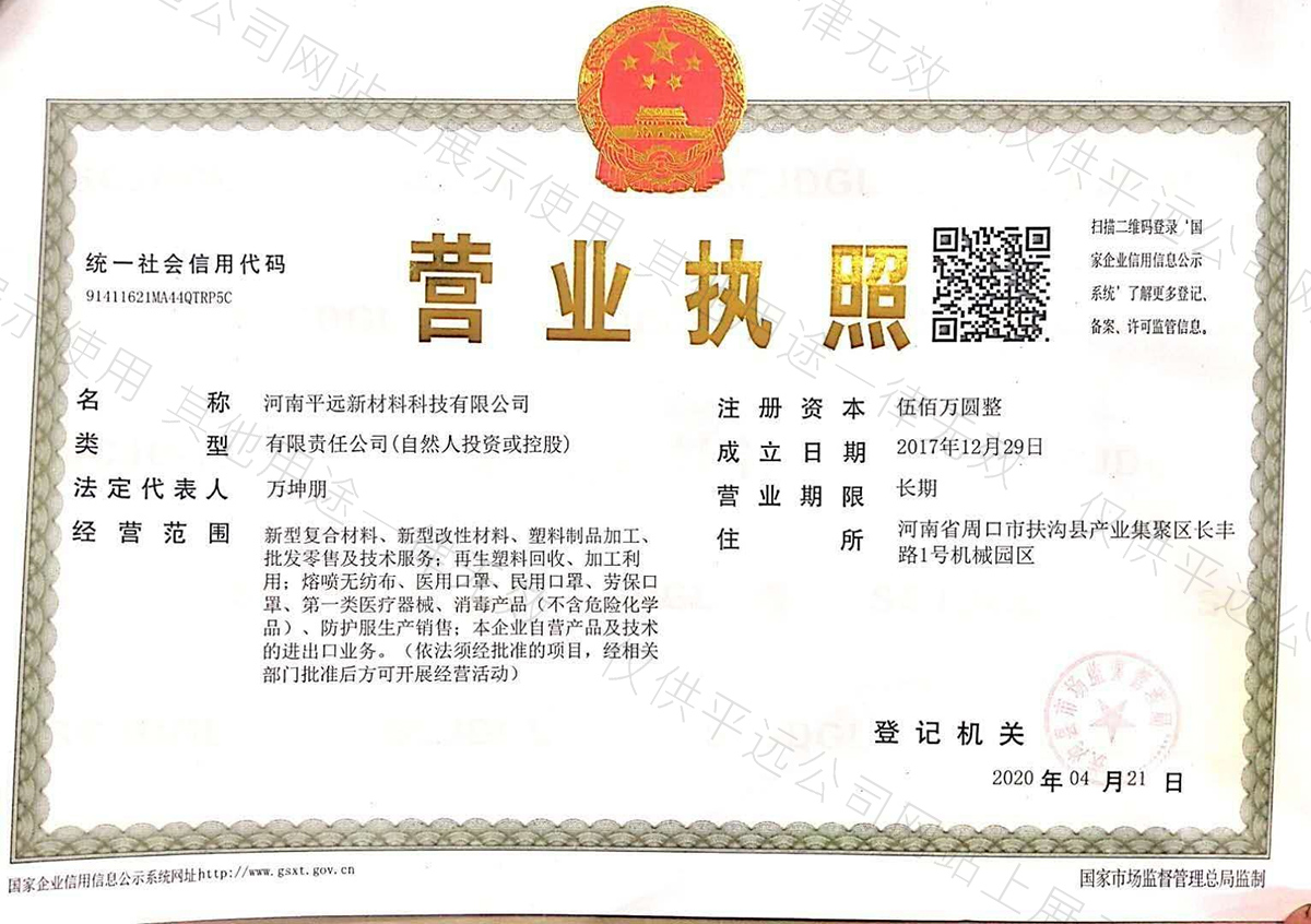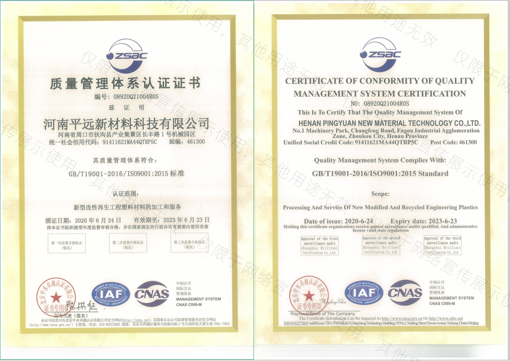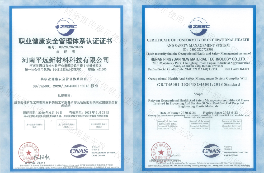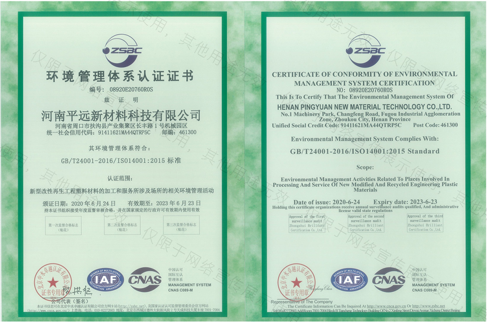 河南平遠新材料科技有限公司生產基地坐落于河南省鄢陵縣先進制造業(yè)開發(fā)區,工廠占地10000平方米。公司通過GRS全球回收標準認證、ISO9001質量體系、14001環(huán)境體系和45001職業(yè)健康安全管理體認證。華東分公司位于浙江省余姚市中國塑料城。